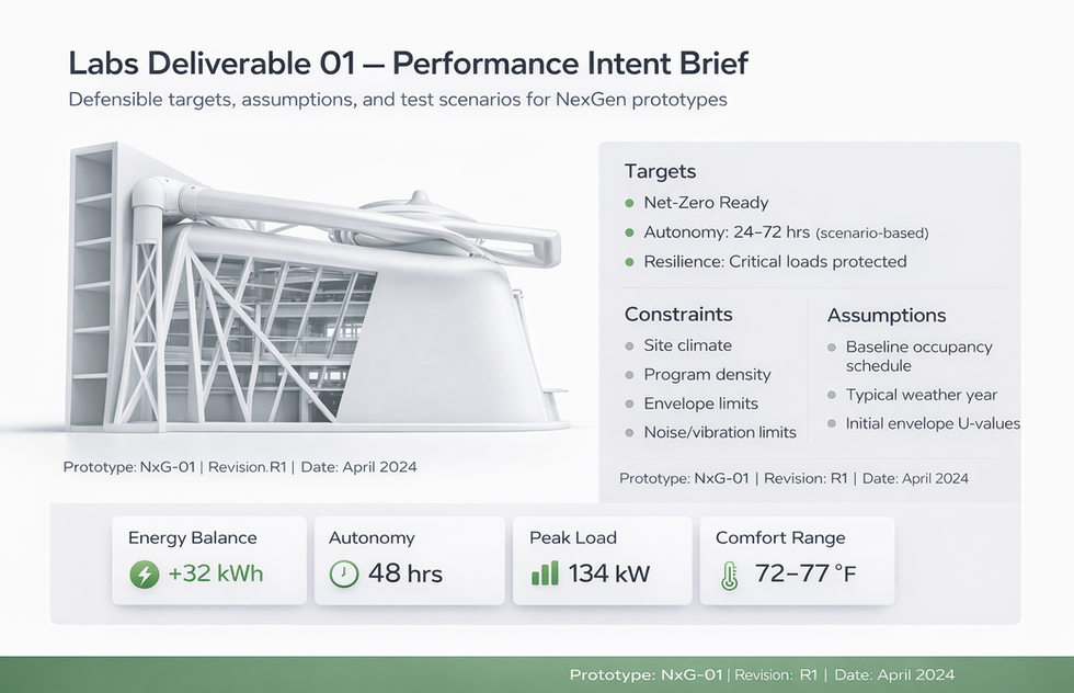 Labs connects three things into one process: NexGen prototypes, the Systems Library (wind, solar, storage, microgrid controls, IAQ, automation), and Digital Twins (BIM-to-analytics). The result is a clear, documented pathway from concept to verified performance intent.